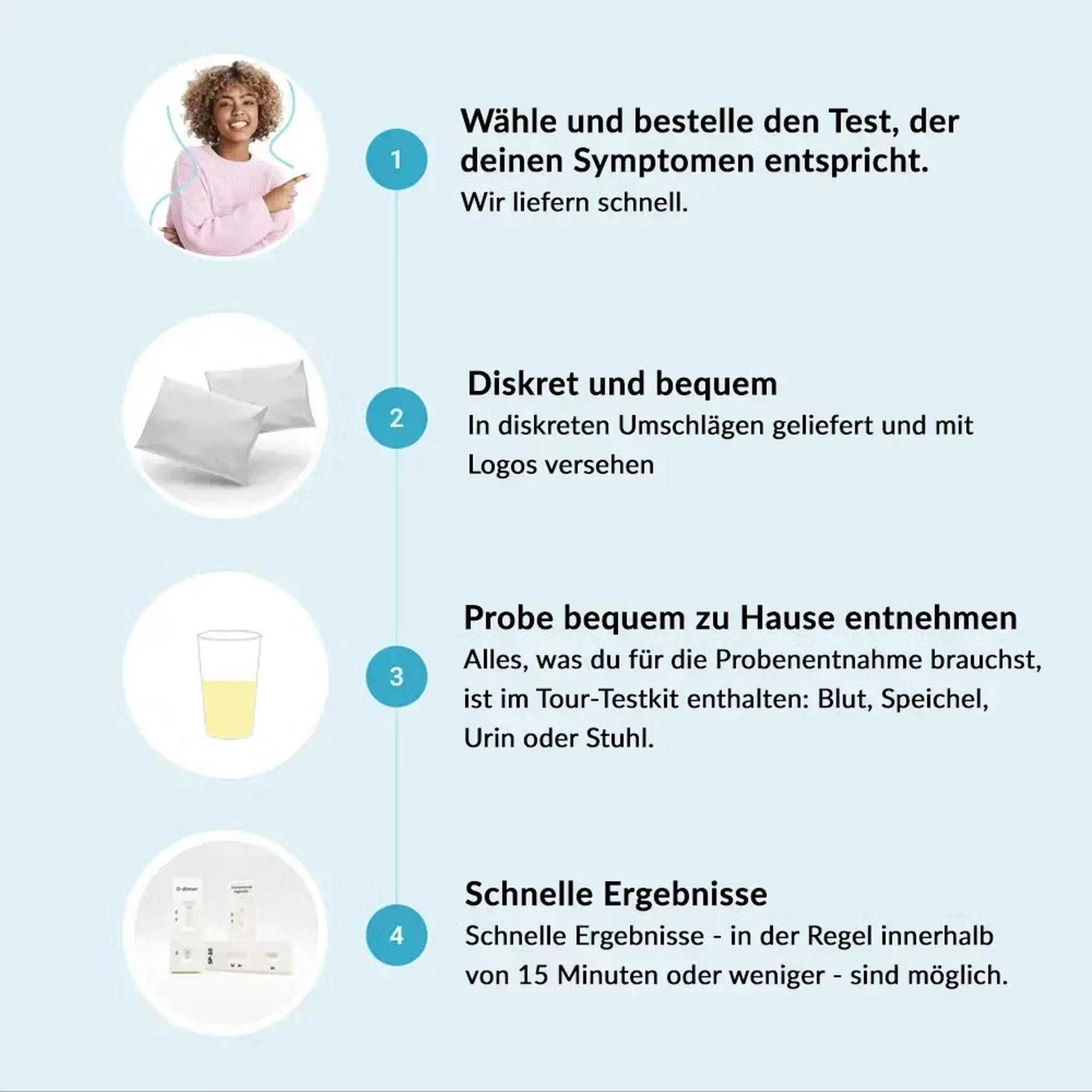 Bereits 15 Minuten nach Abschluss des Tests erhältst du deine Ergebnisse. Diese schnelle Bearbeitung ist ein großer Vorteil, denn sie verkürzt die Wartezeit im Vergleich zu herkömmlichen klinischen Testmethoden erheblich.