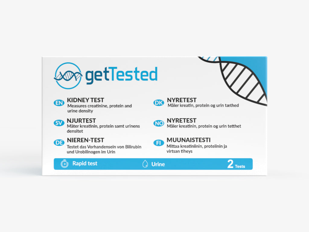 The GetTested kidney test is a simple at-home test that doesn't require sending to a lab for analysis, but provides instant results. The kidney test measures creatinine, protein, and specific gravity in the urine, and the test result is displayed by visual comparison with a color chart on the package.