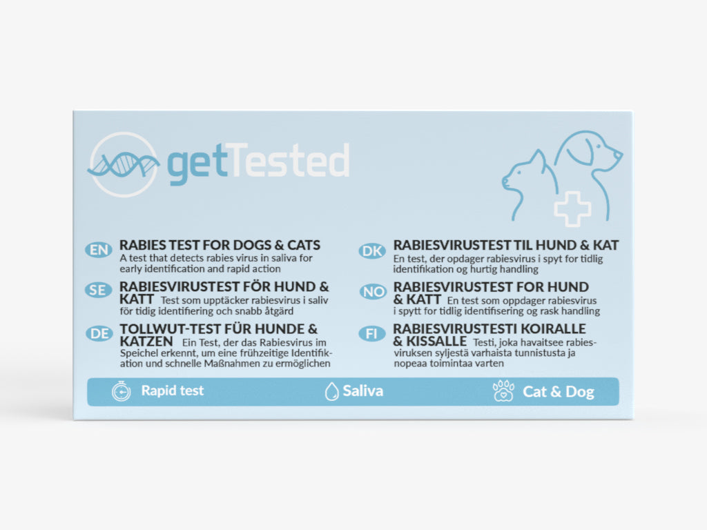 GetTested's Rabies Virus Antigen Rapid Test Kit is a simple and reliable self-test for the qualitative detection of rabies virus antigens in saliva samples from dogs and cats. This test was specifically developed for pet owners and veterinarians and allows for rapid and accurate screening for rabies infection—without the need for laboratory equipment.