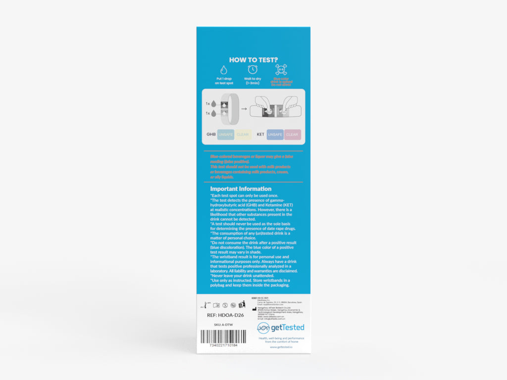 Testen Sie Ihr Getränk auf Verfälschung. Der Test weist das Vorhandensein von Gamma-Hydroxybuttersäure (GHB) und Ketamin (KET) in realistischen Konzentrationen nach.